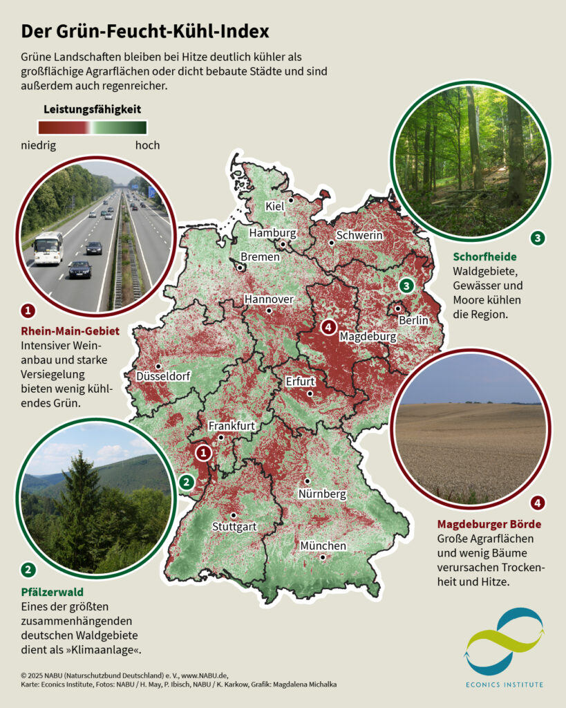 Die Forscher*innen des Econics Instituts haben erstmals einen „Grün-Feucht-Kühl-Index“ für Deutschland veröffentlicht und in Partnerschaft mit dem NABU präsentiert. Der Untersuchungszeitraum umfasste die fünf wärmsten Jahre seit Beginn der Wetteraufzeichnungen. In der Studie wird unter anderem gezeigt, dass die Art der Landnutzung für fast ein Fünftel der Temperaturunterschiede verantwortlich ist und verdeutlicht, dass die Veränderung der Landnutzung ein Schlüssel für die Zukunftsfähigkeit in Deutschland ist. Sie zeigt auch, dass je grüner und je kühler die Landoberfläche war, desto mehr Niederschläge in den Jahren 2018 bis 2024 fielen. Besonders die Ballungsräume und Industriegebiete heizen sich überproportional auf. Aber auch in Regionen mit strukturarmer Landwirtschaft, d.h. große Flächen ohne Bäume, Hecken, Feldgehölze oder kurz gesagt „naturnaher Vegetation“ fallen als Hitzelandschaften ins Gewicht. In Folge wachsen Pflanzen dadurch schlechter, es drohen Wasserknappheit und somit Ernteverluste – Ein Teufelskreis beginnt.