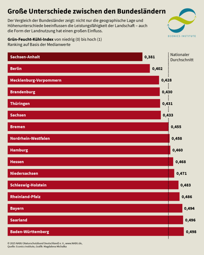 Unter den Flächenländern mit den am wenigsten leistungs- und widerstandsfähigen Landschaften finden sich etwa Sachsen-Anhalt, Mecklenburg-Vorpommern, Thüringen und Brandenburg. Dies ergibt sich nicht nur aus der geographischen Lage und natürlicherweise geringeren Niederschlägen, sondern wird auch durch die ausgedehnten Agrarlandschaften mitgeprägt. Stark bewaldete Regionen in der Müritzregion und der Schorfheide zeigen, wie sehr die Vegetation hilft, Extreme abzupuffern. In allen Bundesländern gibt es Regionen, in denen dringend in die Verbesserung oder Erhaltung der Leistungsfähigkeit der Ökosysteme investiert werden muss.“